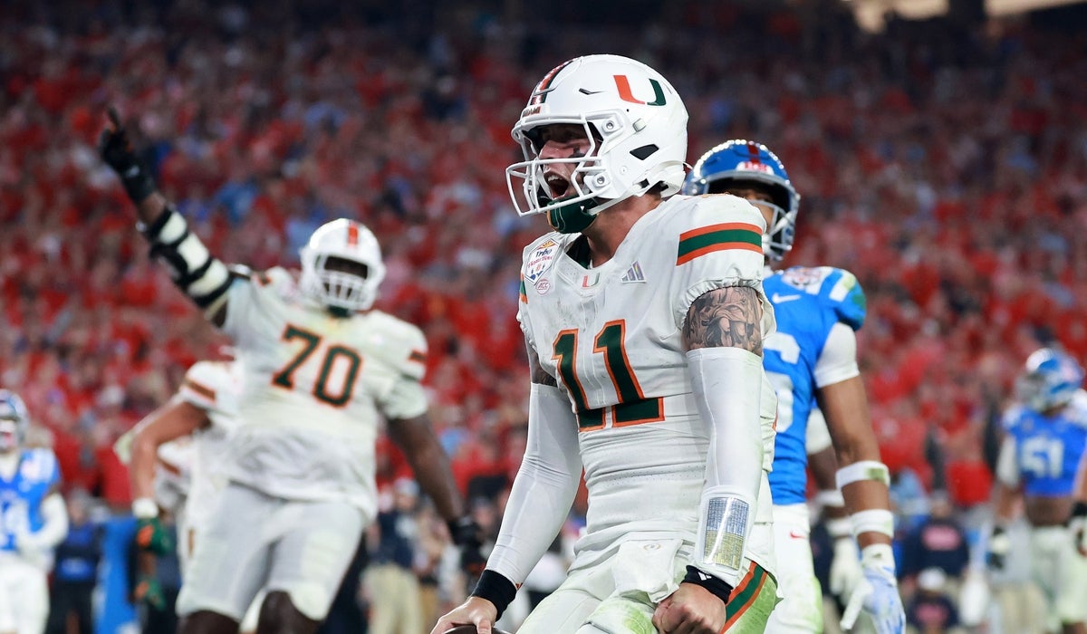 Miami Hurricanes quarterback Carson Beck (11) rushes for a touchdown against the Mississippi Rebels in the second half during the 2026 Fiesta Bowl and semifinal game of the College Football Playoff at State Farm Stadium