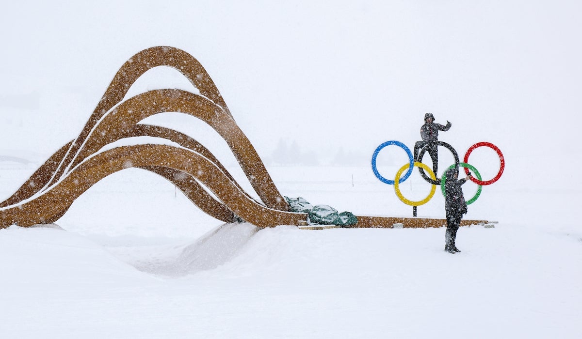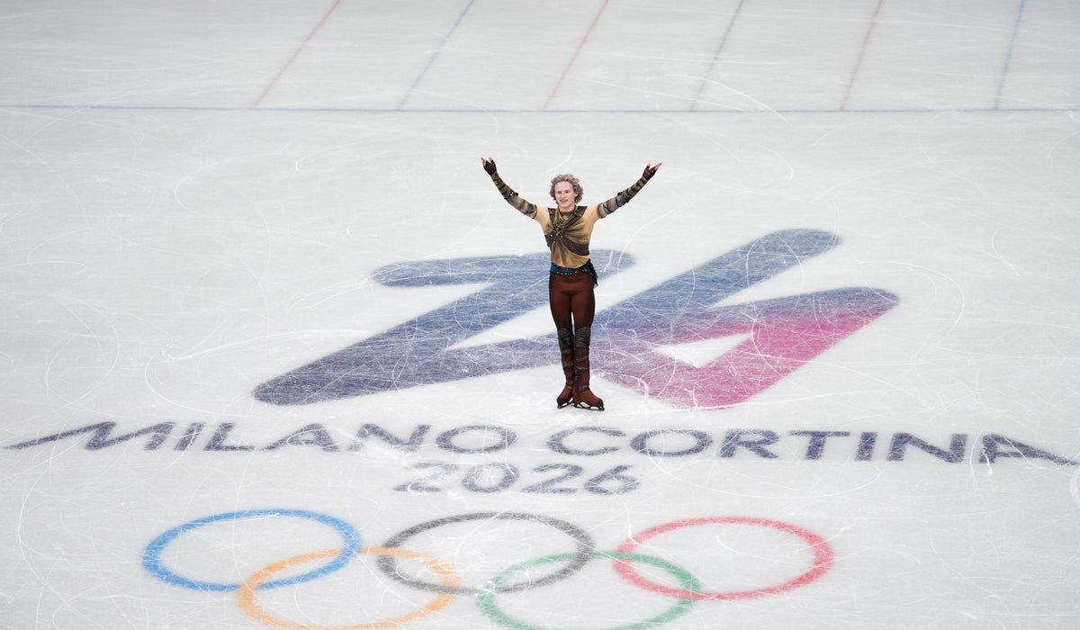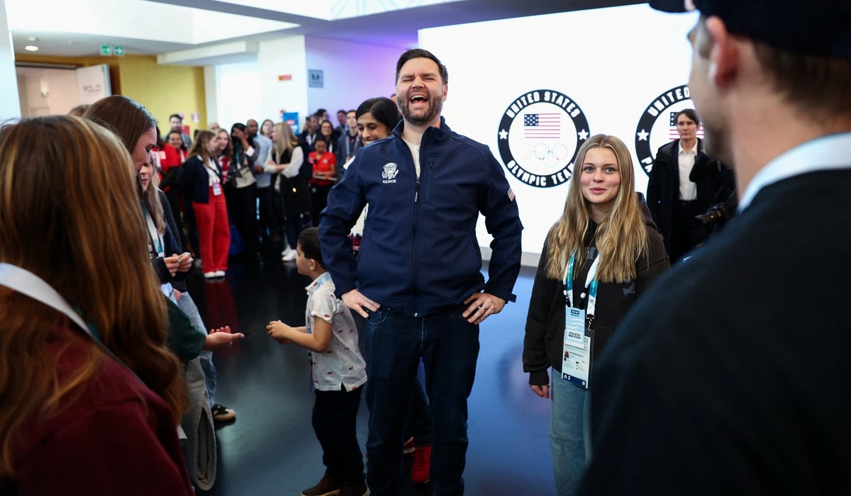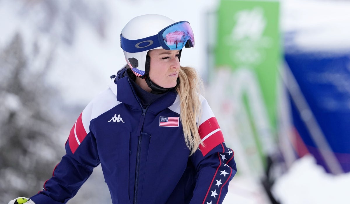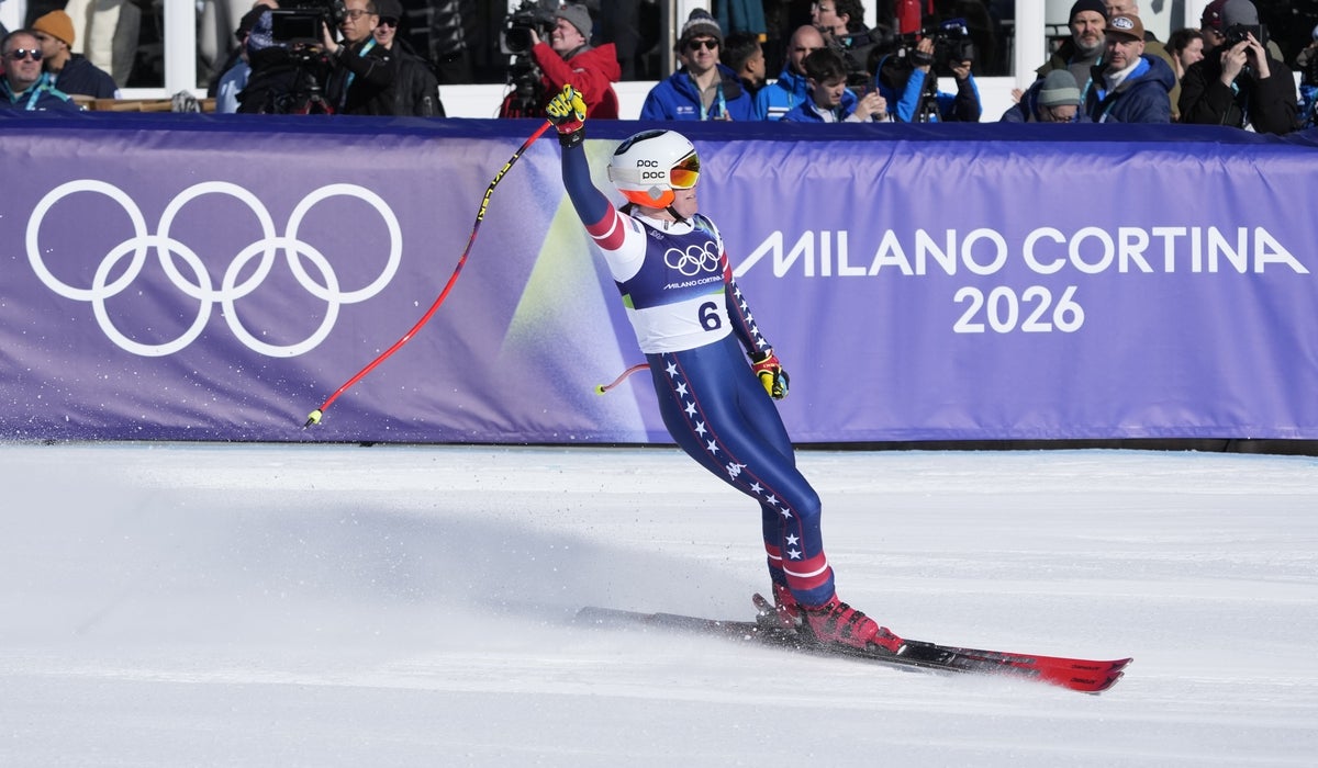 Breezy Johnson of the United States celebrates in the finish area in the women's downhill alpine skiing race during the Milano Cortina 2026 Olympic Winter Games at Tofane Alpine Skiing Centre