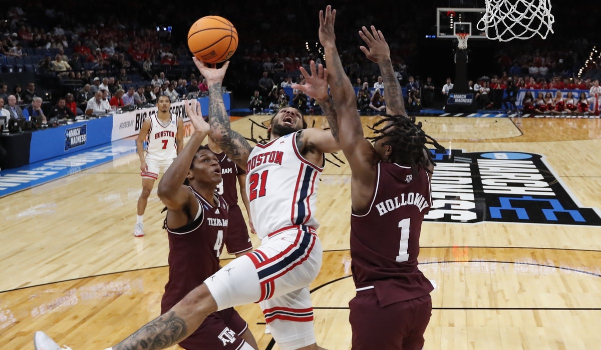 Houston Cougars guard Emanuel Sharp (21) drives to the hoop past Texas A&M Aggies forward Jamie Vinson (4) and guard Josh Holloway (1) during the first half of a second round game of the men's 2026 NCAA Tournament at Paycom Center