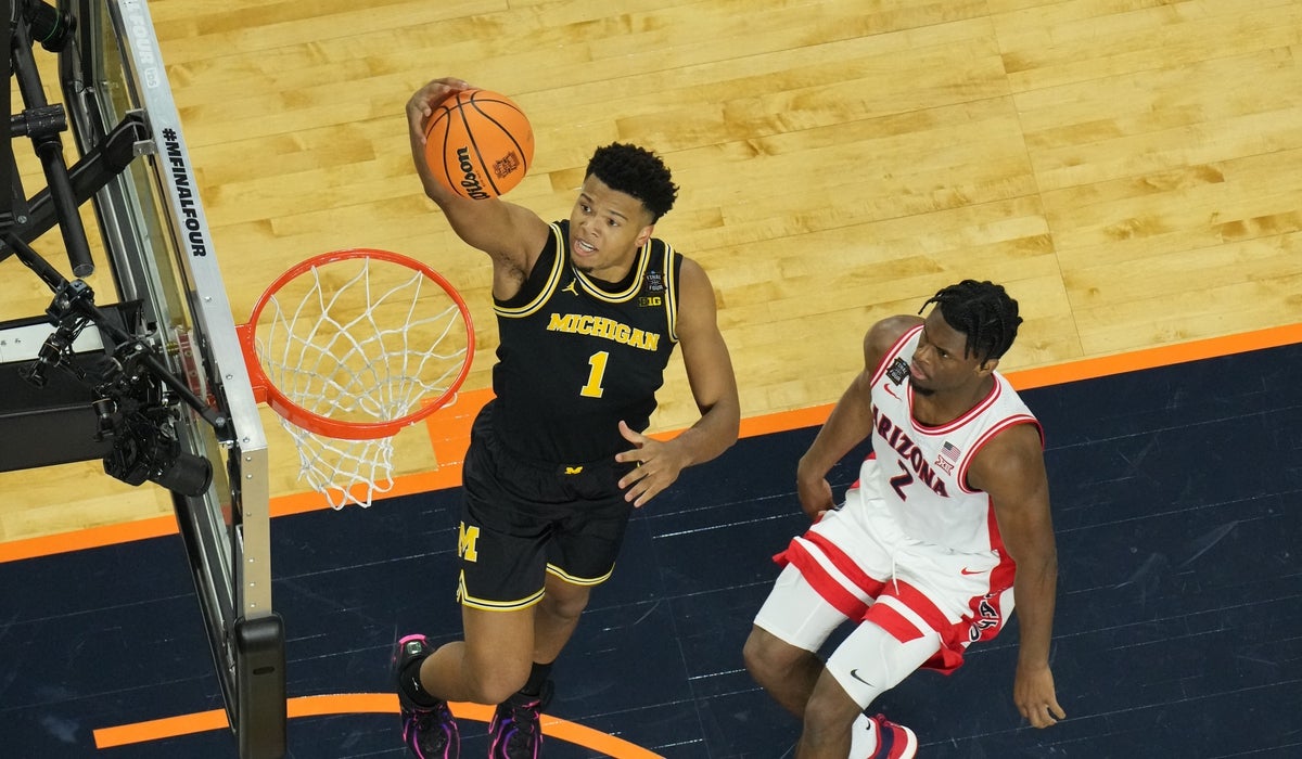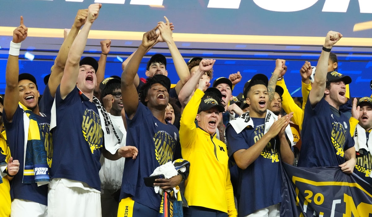 Michigan Wolverines head coach Dusty May celebrates with his players on stage after defeating the Connecticut Huskies in the national championship of the Final Four of the men's 2026 NCAA Tournament at Lucas Oil Stadium