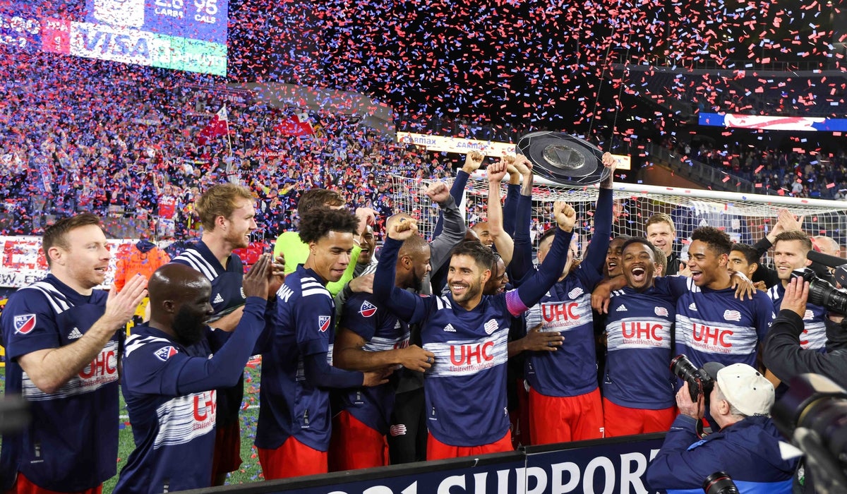 New England Revolution midfielder Carles Gil (22) celebrates winning the 2021 Supporters Shield after playing Inter Miami CF at Gillette Stadium