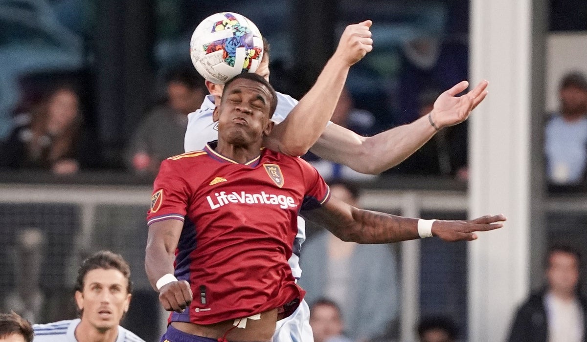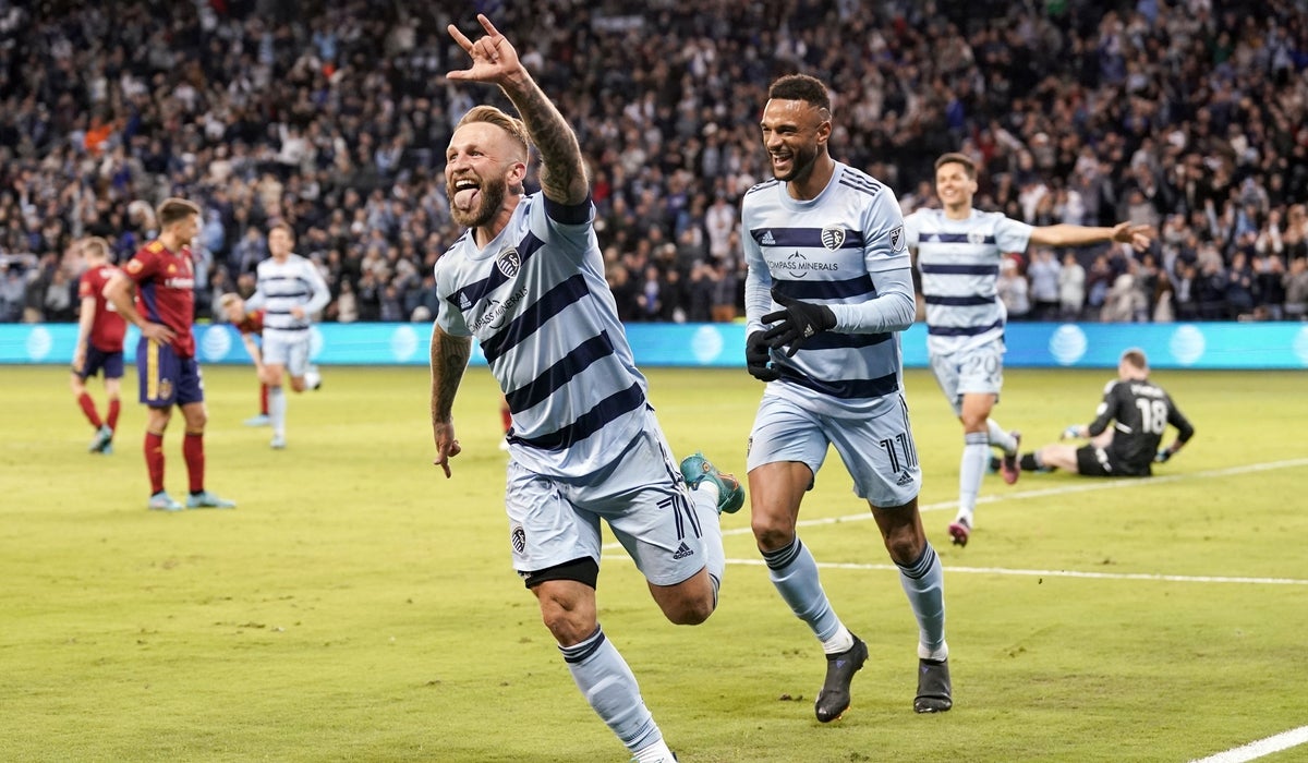 Sporting Kansas City forward Johnny Russell (7) celebrates after scoring against Real Salt Lake during the second half at Children's Mercy Park