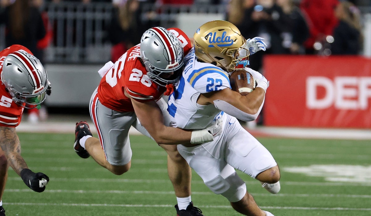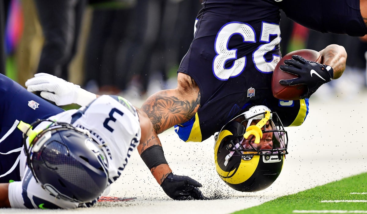 Los Angeles Rams running back Kyren Williams (23) is tackled by Seattle Seahawks safety Nick Emmanwori (3) during the first half at SoFi Stadium