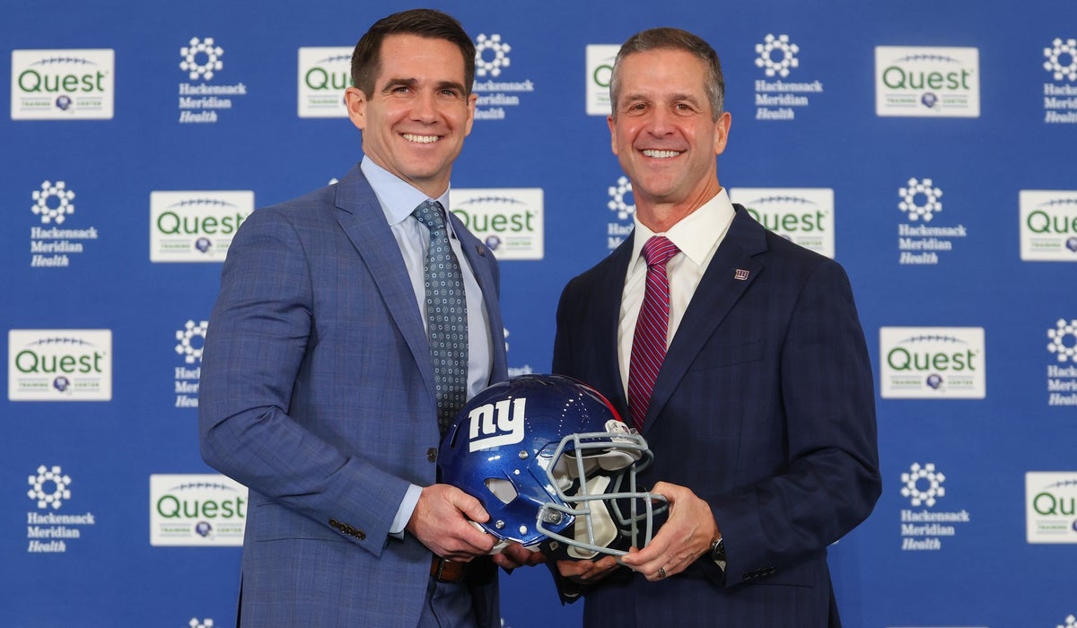 New York Giants general manager Joe Schoen and head coach John Harbaugh pose after the press conference announcing Harbaughís hiring at Quest Diagnostics Training Center